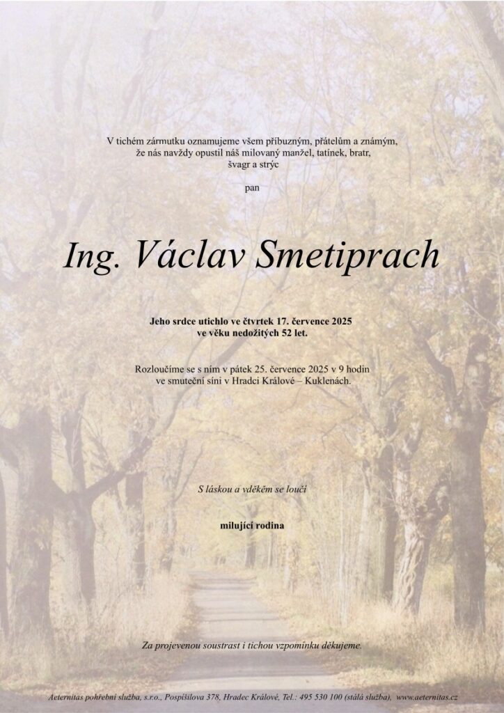 S hlubokým zármutkem oznamujeme, že dne 17. července 2025 zemřel náš kolega, člen představenstva, ale především přítel pan Václav Smetiprach, ve věku nedožitých 52 let.